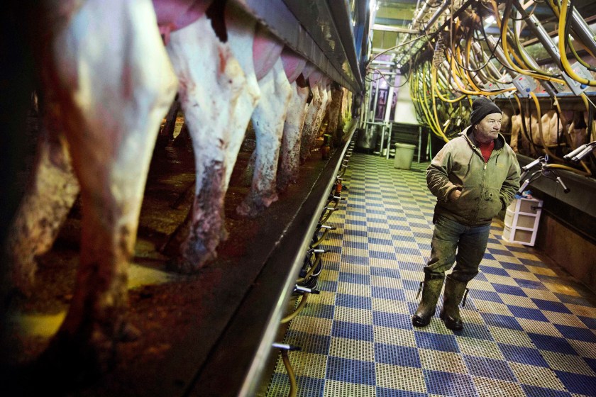 Bernard Moravits inspects cows being milked at his farm in Bloomington, Wisconsin. Though he’s struggling financially, Moravits doesn’t support Trump’s “stupid wall” and his plan to deport Hispanic laborers. He has Hispanic workers who have been with him 15 years and he says he trusts them to do a dirty, difficult job that he said white people aren’t willing to do anymore. (AP Photo/David Goldman)