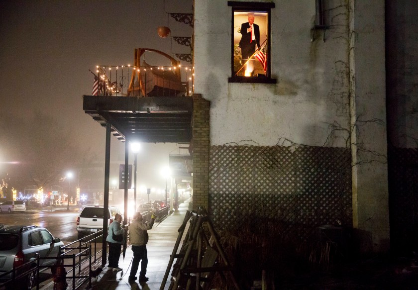 A cardboard cutout of President Donald Trump sits in a window as pedestrians notice it from below in McGregor, Iowa. Some 50 counties along the Mississippi River in Minnesota, Wisconsin, Iowa, and Illinois, switched from blue to red in November. (AP Photo/David Goldman)
