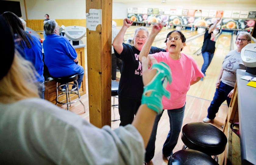 Jackie Suelflow, right, and Mikey Clanton, left, dance and sing during a ladies bowling night in Prairie du Chien, Wis. Their hometown is the second-oldest community in the state and also one of the poorest. (AP Photo/David Goldman)