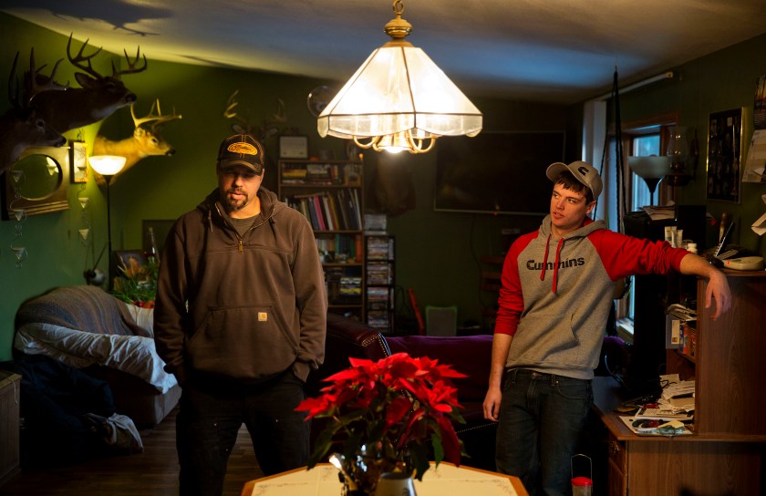 Jeff McCullick, left, stands next to his son Dylan, 18, in their home in Ferryville, Wisconsin. A recent high school graduate, Dylan said he’s worried about the lack of job opportunities in the county and is considering going to technical school to become a diesel mechanic. His father works in maintenance in a federal government job. (AP Photo/David Goldman)