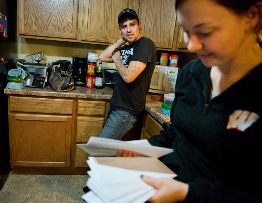 Kreig Holt, left, and his wife, Lydia, stand in their kitchen in Wauzeka, Wisconsin. They both earn about $10 an hour and, with two kids, there’s always one or two bills they have to skip. At this rate, Lydia says they’ll be paying these same bills for 87 years. (AP Photo/David Goldman)