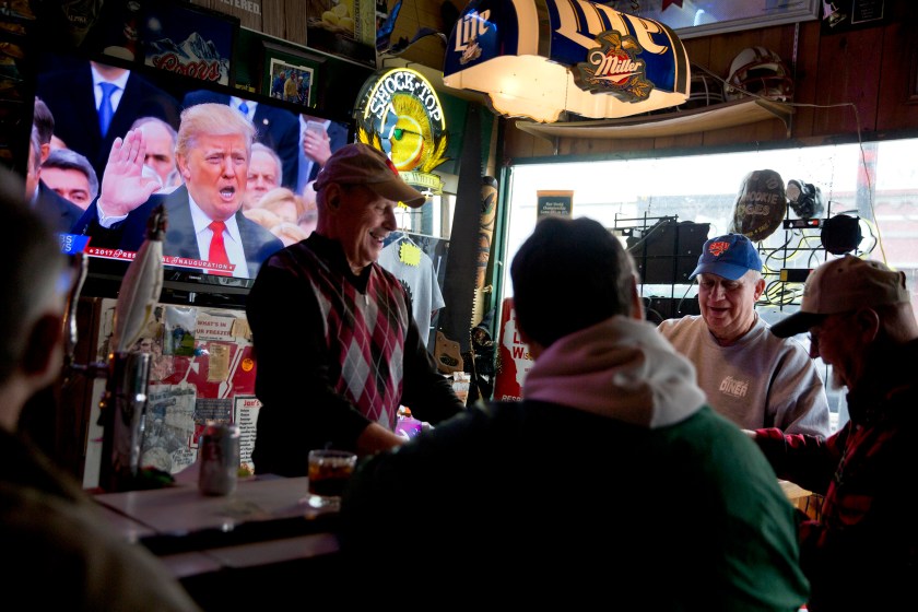 Donald Trump is sworn in as president as Denny Riebe, from right, Doug Dickman, Scott Reilly, and Bill Winter, play cards at the Sawmill Saloon in Prairie du Chien, Wisconsin. (AP Photo/David Goldman)