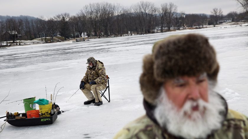 Trump voter Rick Trudo, foreground, ice fishes with his friend and Clinton voter, Mark Kleinow, on the Mississippi River in Prairie du Chien, Wisconsin. (AP Photo/David Goldman)