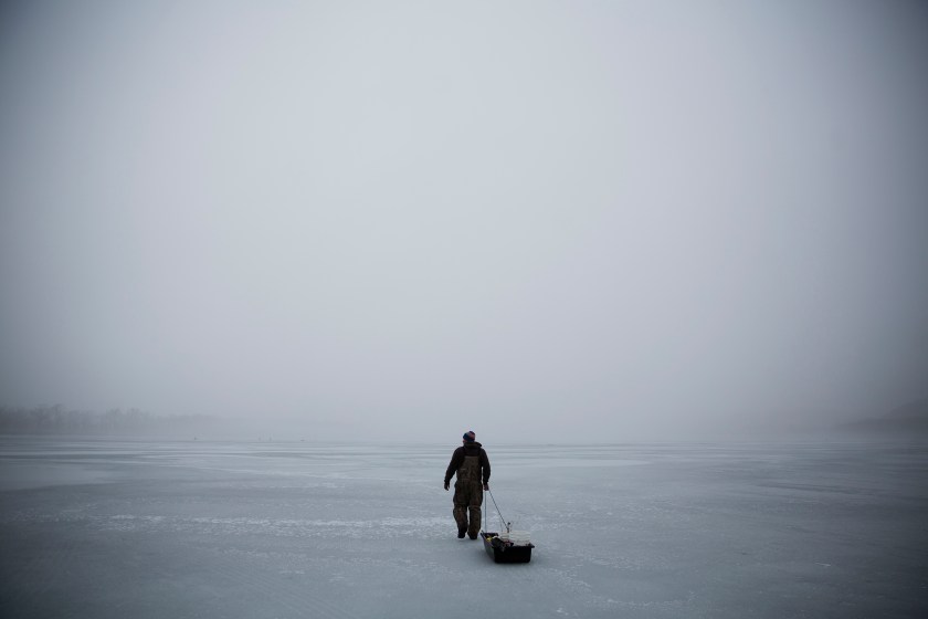 An ice fisherman walks out on a frozen portion of the Mississippi River in Prairie du Chien, Wisconsin. (AP Photo/David Goldman)
