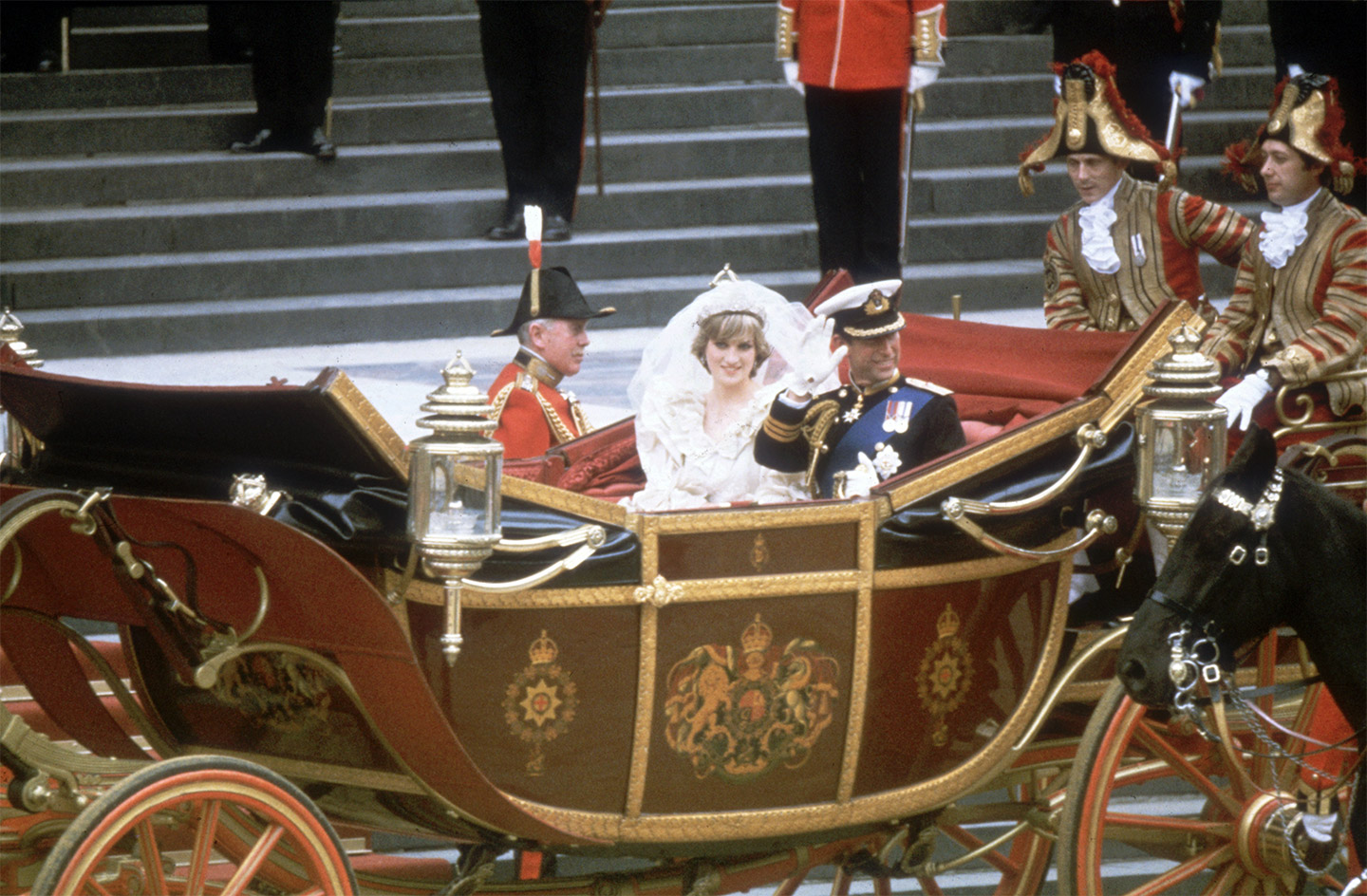 Prince Charles and Princess Diana wave to the crowds following their wedding ceremony at St Paul’s Cathedral, London on July 29, 1981. (Hulton Archive/Getty Images)