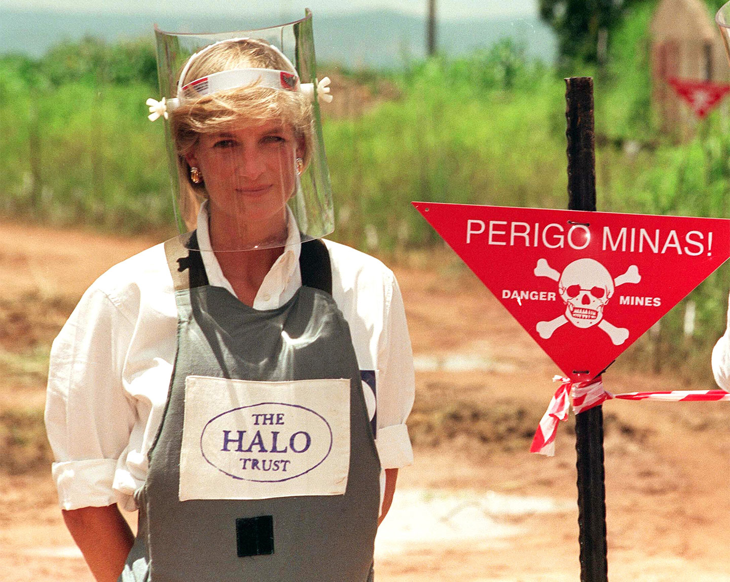 Diana wears body armor during a visit to a landmine on January, 1997 in Angola. (Anwar Hussein Collection/Getty Images)