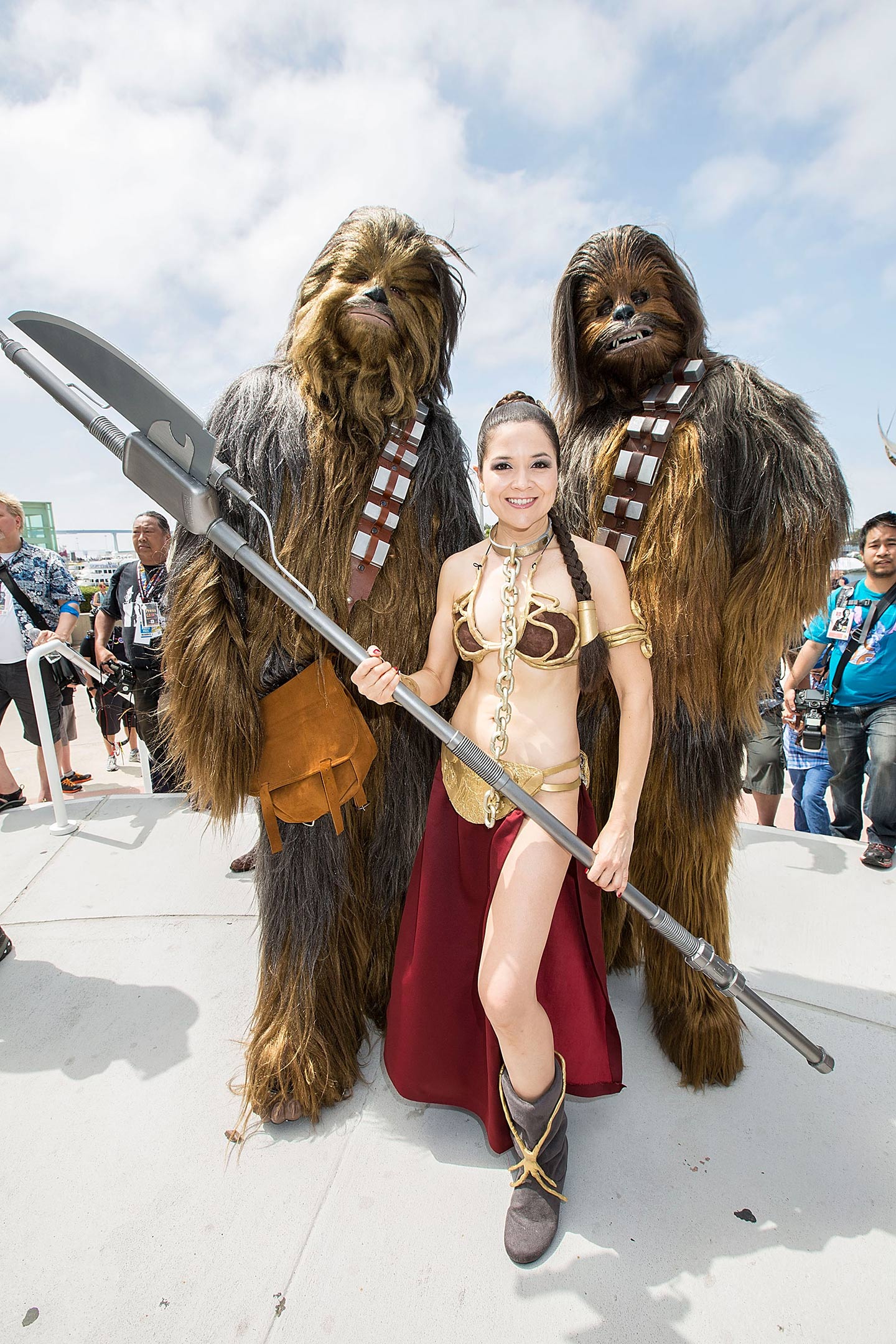 Princess Leia and two Chewbaccas. (Daniel Knighton/FilmMagic)