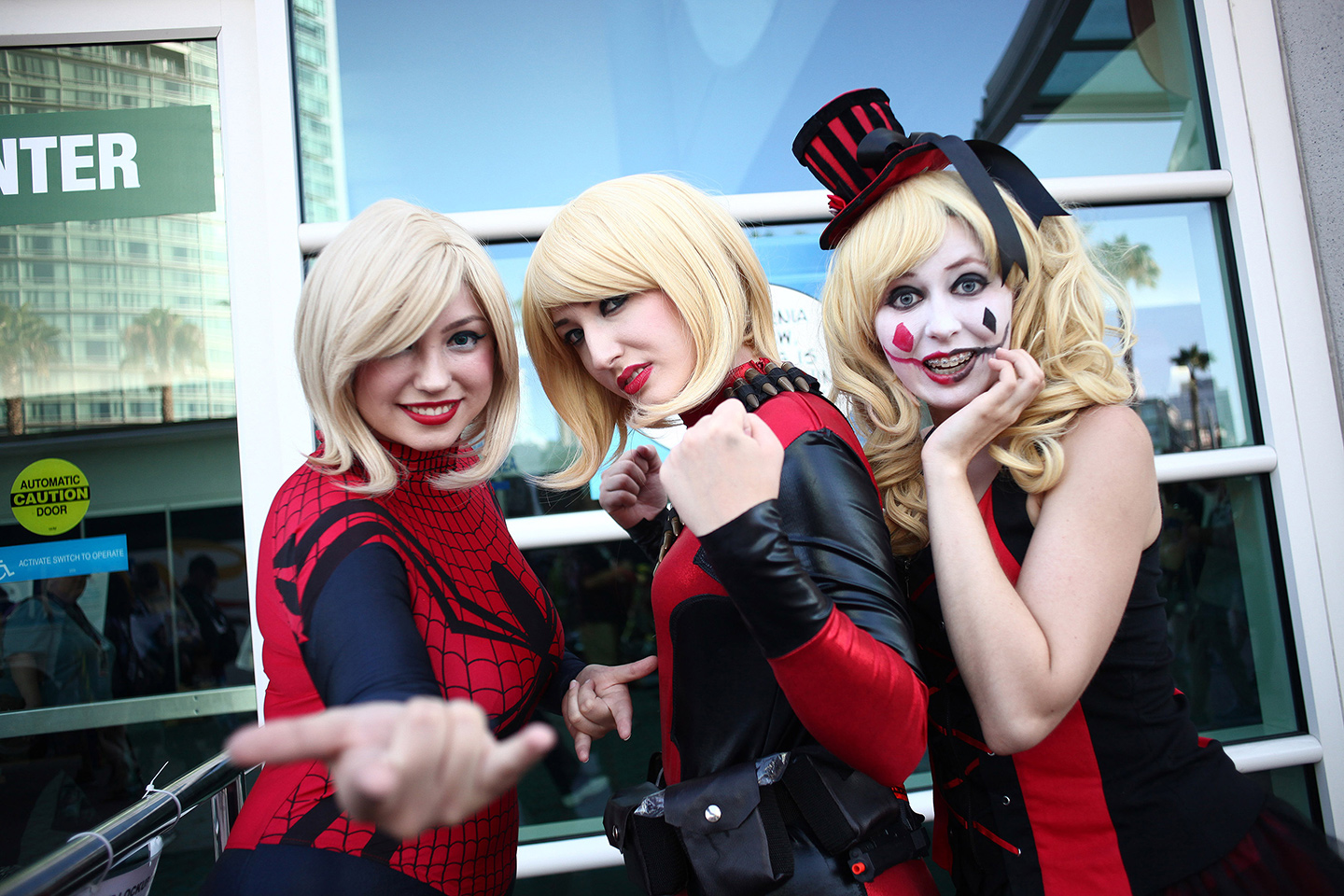 Cosplayers dressed as Spiderwoman, Lady Deadpool and Harley Quinn. (Tommaso Boddi/Getty Images)
