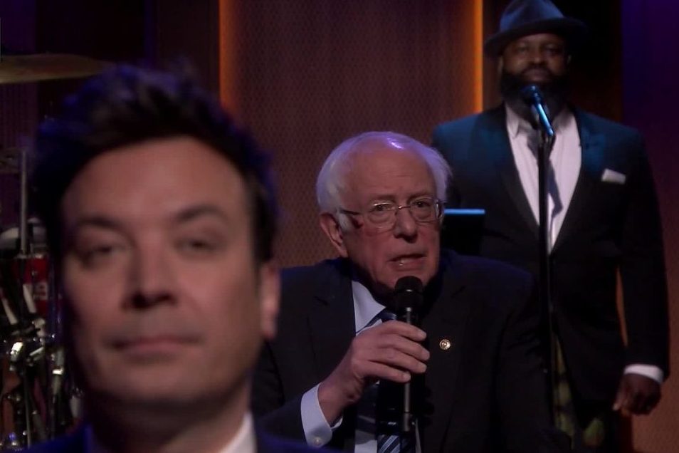 The senator was a good sport for the bit, though Fallon did most of the actual slow-jamming, referring to Sanders as “woke Doc Brown” and responding to the candidate’s declaration that “we can no longer tolerate three people hoarding more wealth than the bottom half of America. I have the experience to fight for that bottom half and to create an economy that works for all of us, not just those on top” with “awww yeah, Bernie Sanders is looking out for your bottom half.”