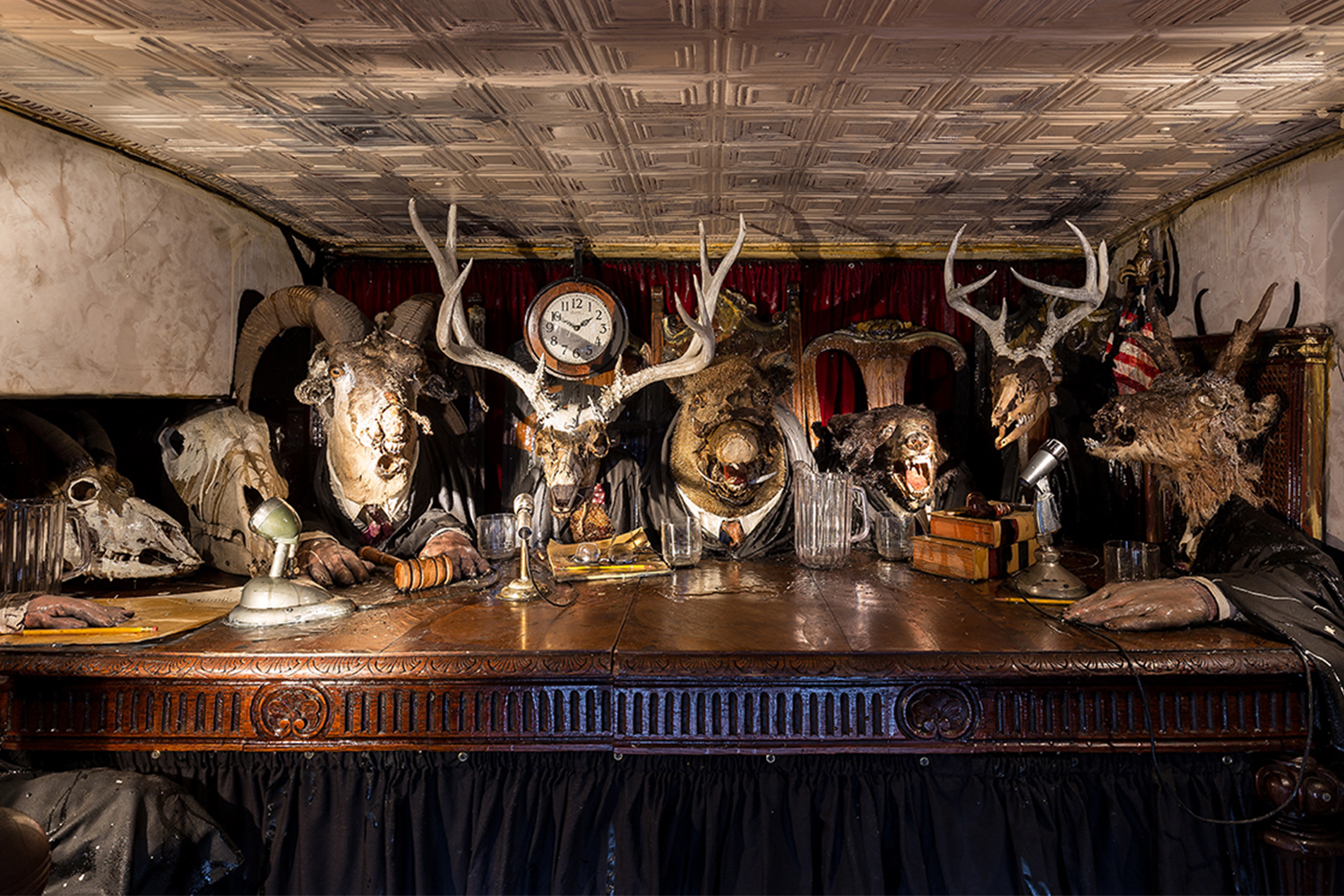 To make the sculpture’s main structure, a 1966 Dodge van was welded into the middle of a 1978 Cadillac. Inside the resulting Frankenstein-style vehicle, there’s a haunting scene intended to evoke a bizarro version of the U.S. Supreme Court—the justices reimagined as animals, including a ram and a bear.
