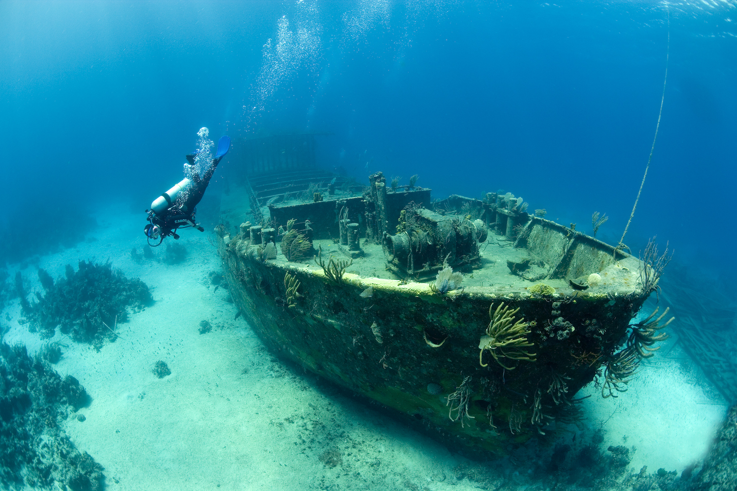 Scuba Diver Exploring a Large Shipwreck in the bahamas. A sunken treasure of booze and gold is planning to be excavated in Lake Michigan soon.