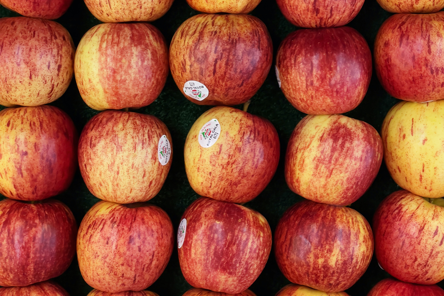 A bunch of Gala apples at a grocery store with produce stickers. A new article at The Verge looks at how these stickers do not decompose in their current form.