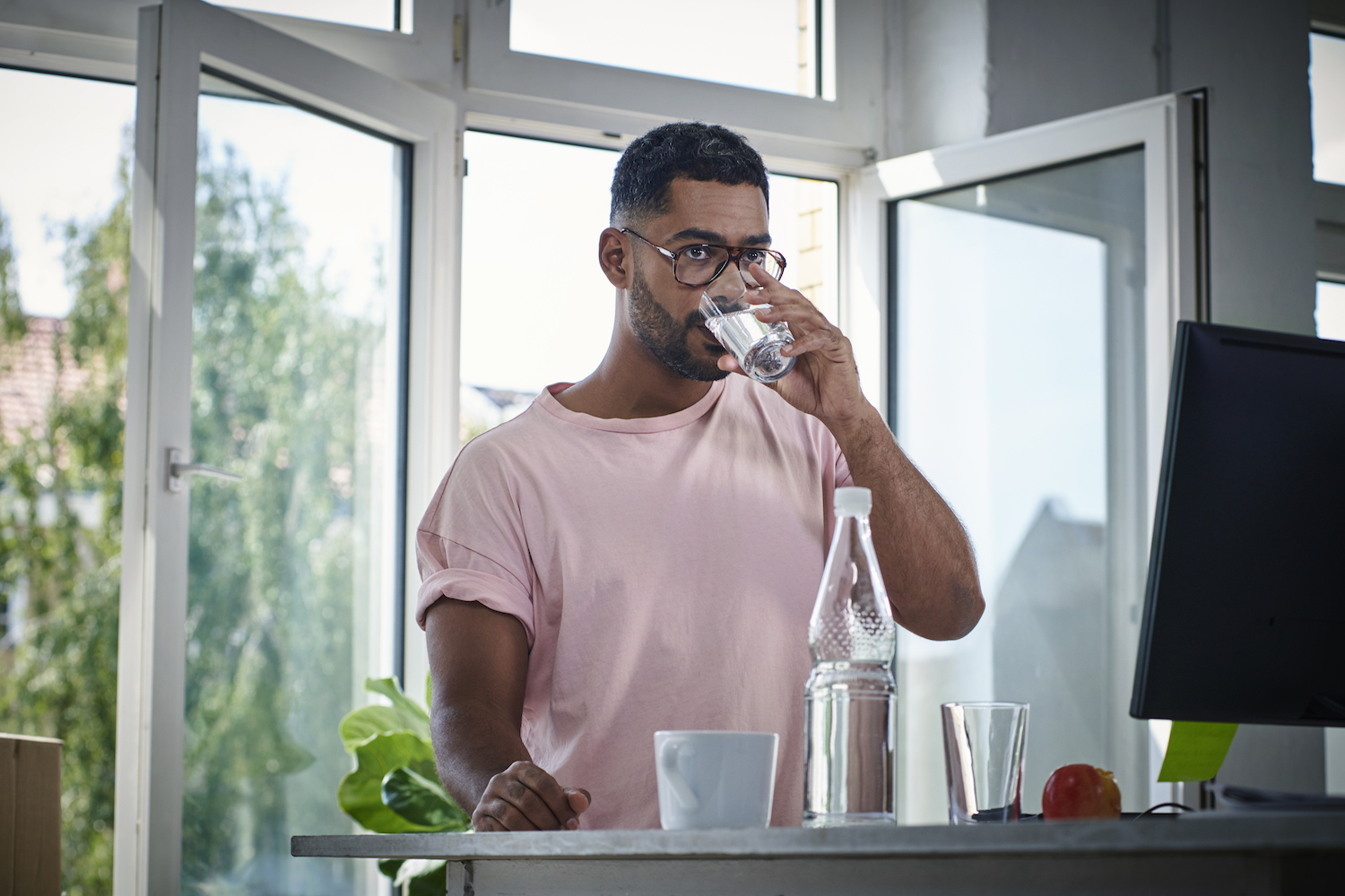 man in a pink tee shirt and glasses drinking water
