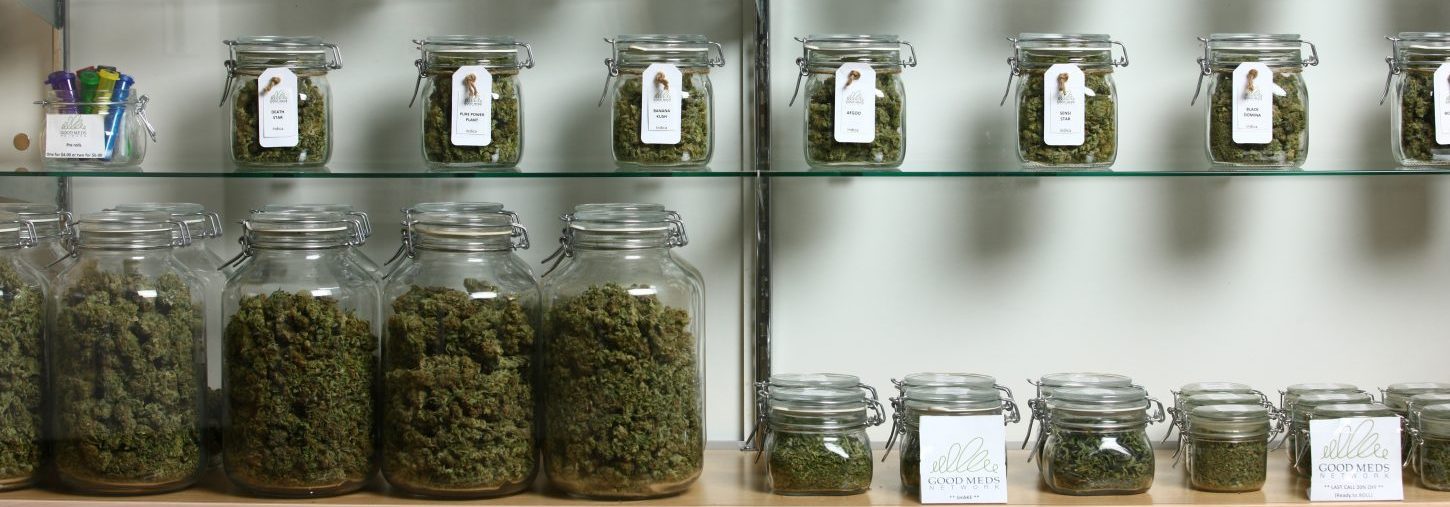 Jars of medical cannabis line the shelves inside a Good Meds medical cannabis center.