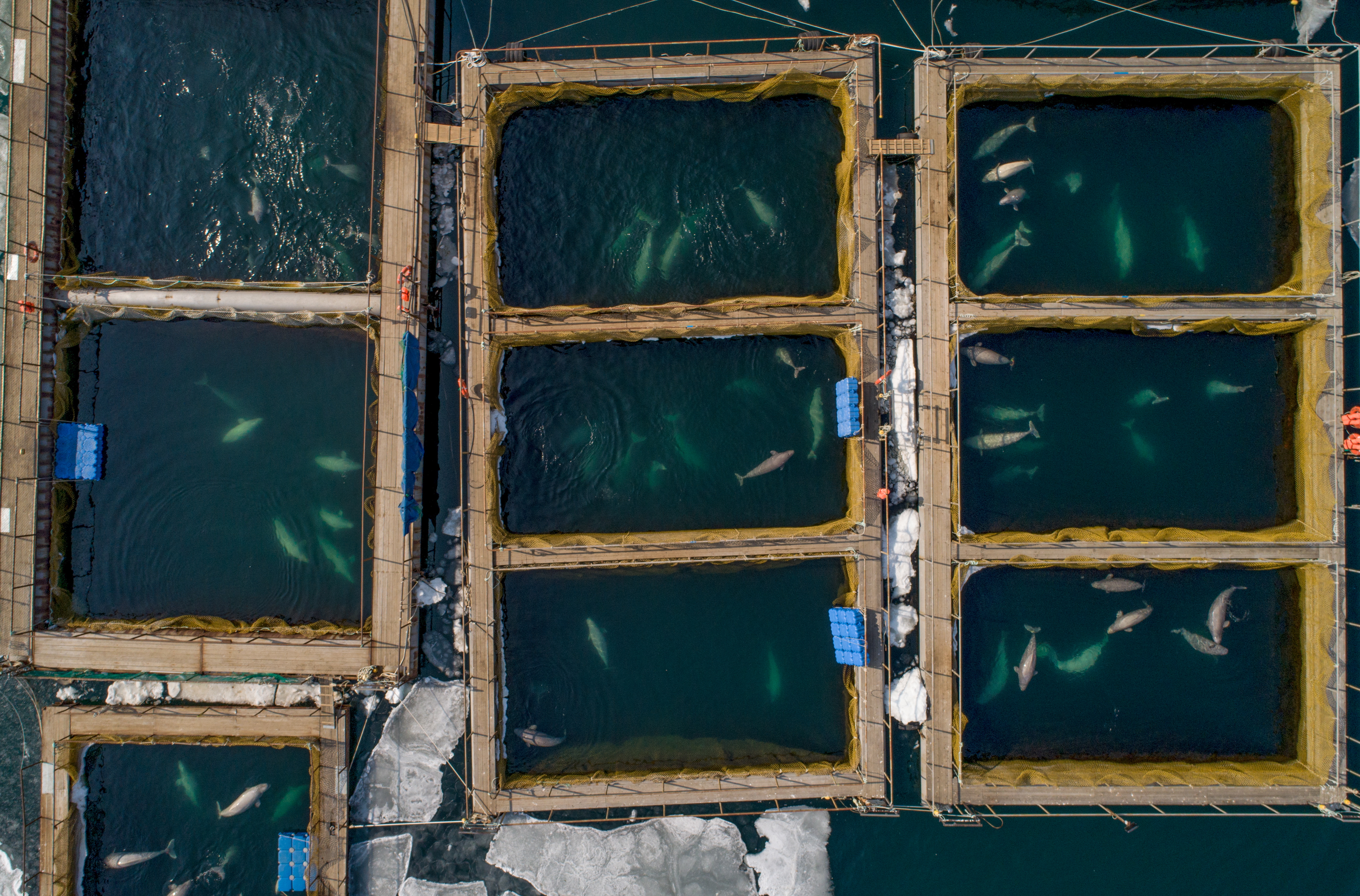 An aerial view of pools in the marine animals adaptation centre where illegally caught 11 orcas and 90 belugas that were to be sold to Chinese amusement parks are being kept, in Srednyaya Bay near the city of Nakhodka in Russia's Far East. It has been reported that 1 orca and 3 beluga whales are missing. Russian prosecutors have launched a criminal investigation into the illegal capture of the animals. On February 22, 2018, Russian President Vladimir Putin has told the Russian Environment Ministry and Russian Agriculture Ministry to look into the matter. Yuri Smityuk/TASS (Photo by Yuri SmityukTASS via Getty Images)