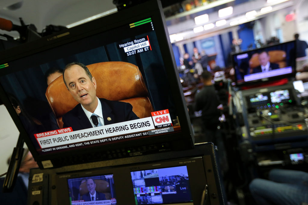 Members of the media watch the first public impeachment hearing in the Brady Press Briefing Room of the White House on November 13, in Washington, DC.