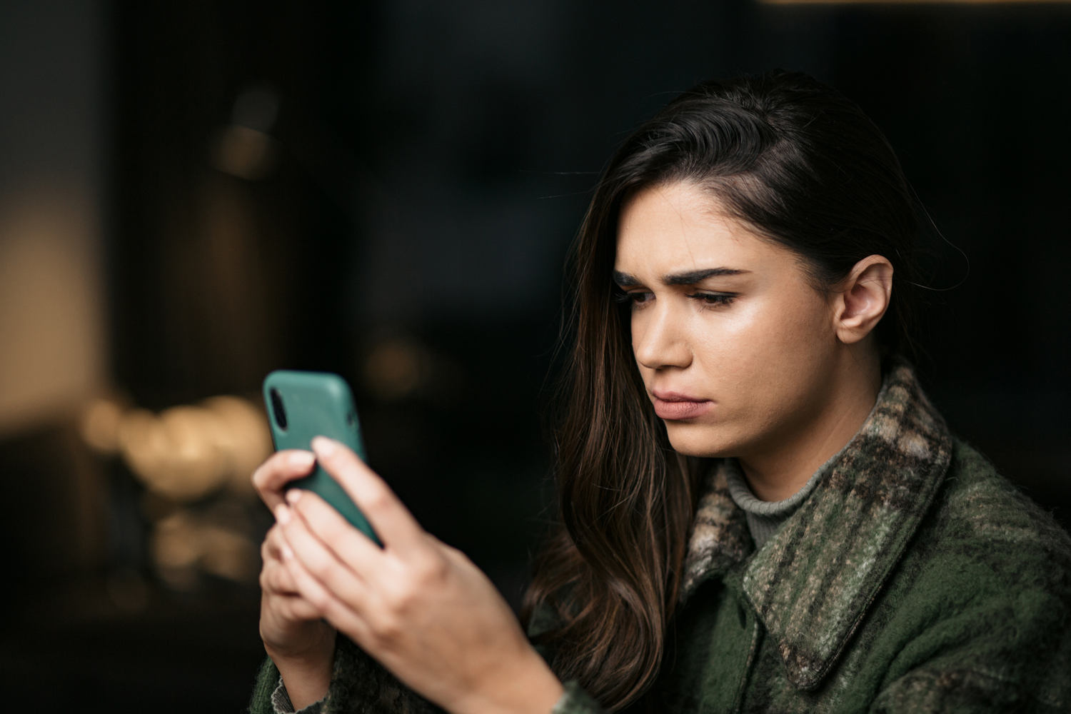 Close up of a depressed Caucasian young woman sitting at home, reading some bad news on her smart phone, feeling sad and worried