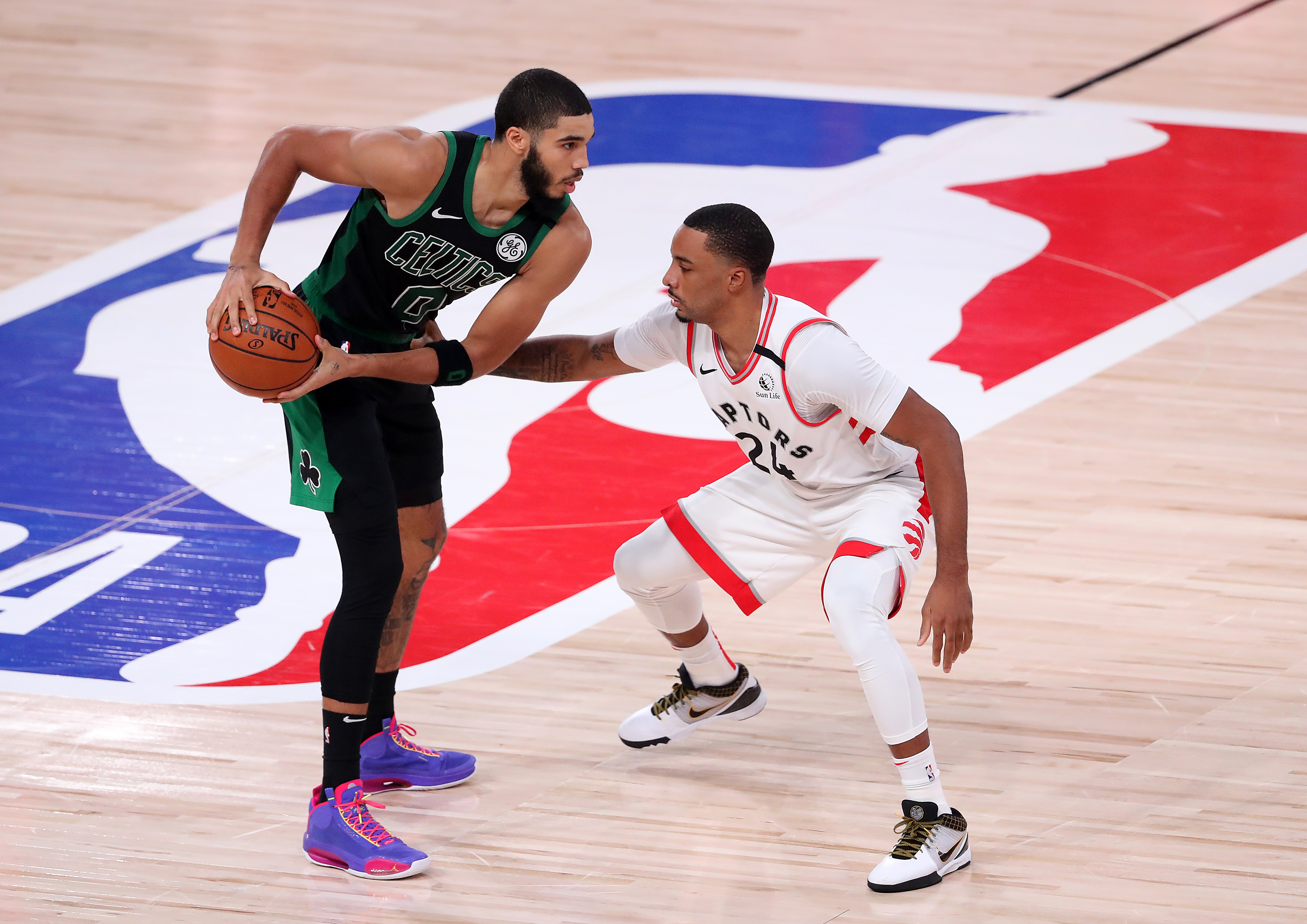 Jayson Tatum drives the ball while being defended by Raptors guard Norman Powell.