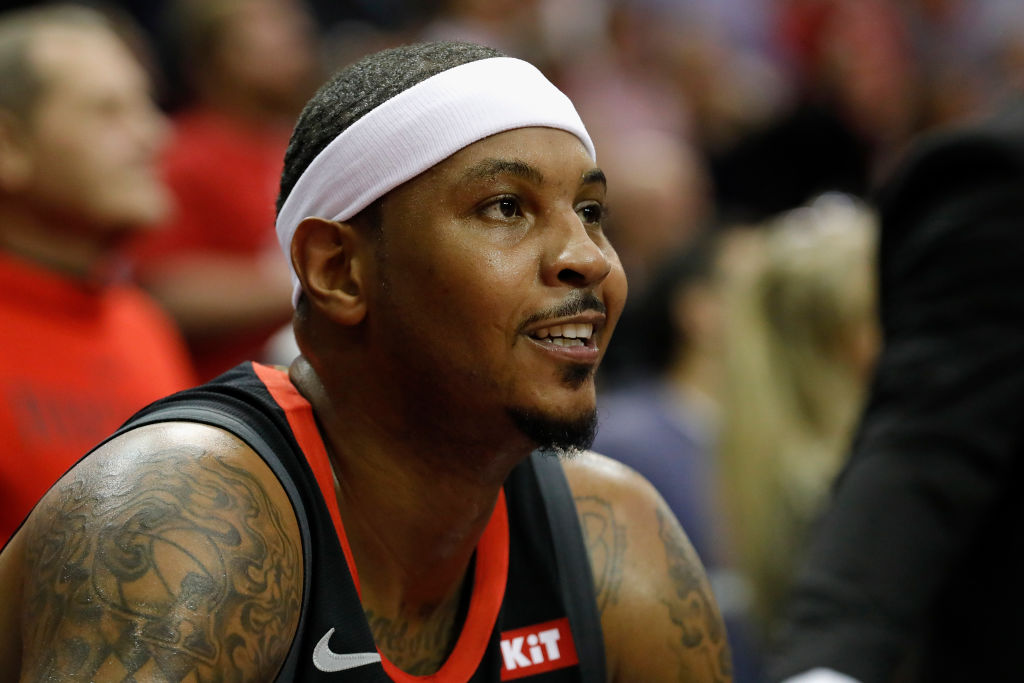 Carmelo Anthony sits on the bench in 2018. (Tim Warner/Getty)