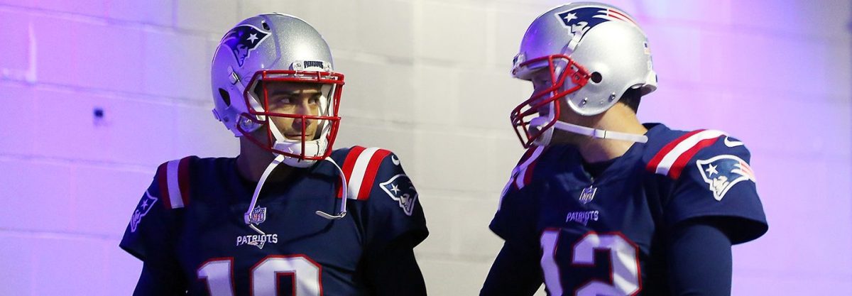 Tom Brady #12 and Jimmy Garoppolo #10 of the New England Patriots