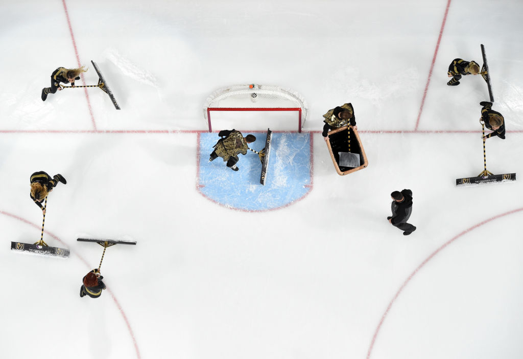 Members of the Knights Crew clean the ice during Game One of the Western Conference First Round during the 2018 NHL Stanley Cup Playoffs during the 2018 NHL Stanley Cup Playoffs between the Los Angeles Kings and the Vegas Golden Knights at T-Mobile Arena on April 11, 2018 in Las Vegas, Nevada. The Golden Knights won 1-0.  (Photo by Ethan Miller/Getty Images)