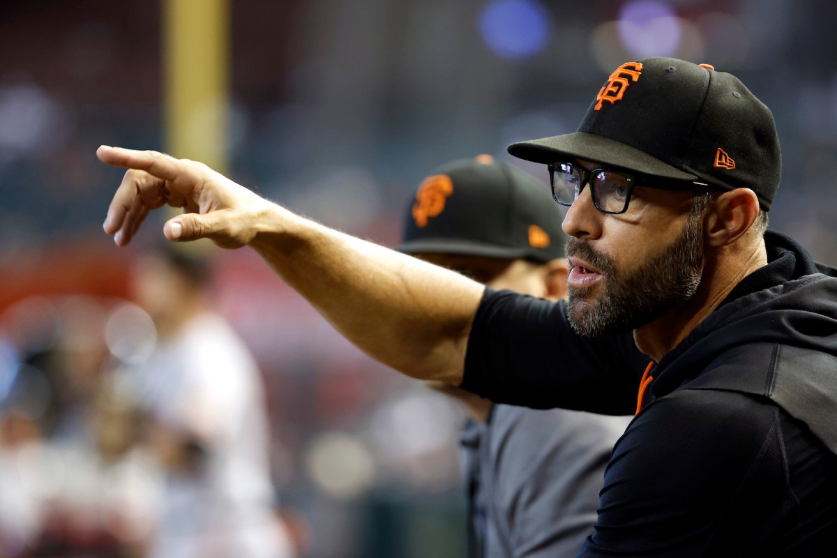 Manager Gabe Kapler #19 of the San Francisco Giants gestures during the game against the Arizona Diamondbacks at Chase Field on September 25, 2022 in Phoenix, Arizona. The Giants beat the Diamondbacks 3-2.