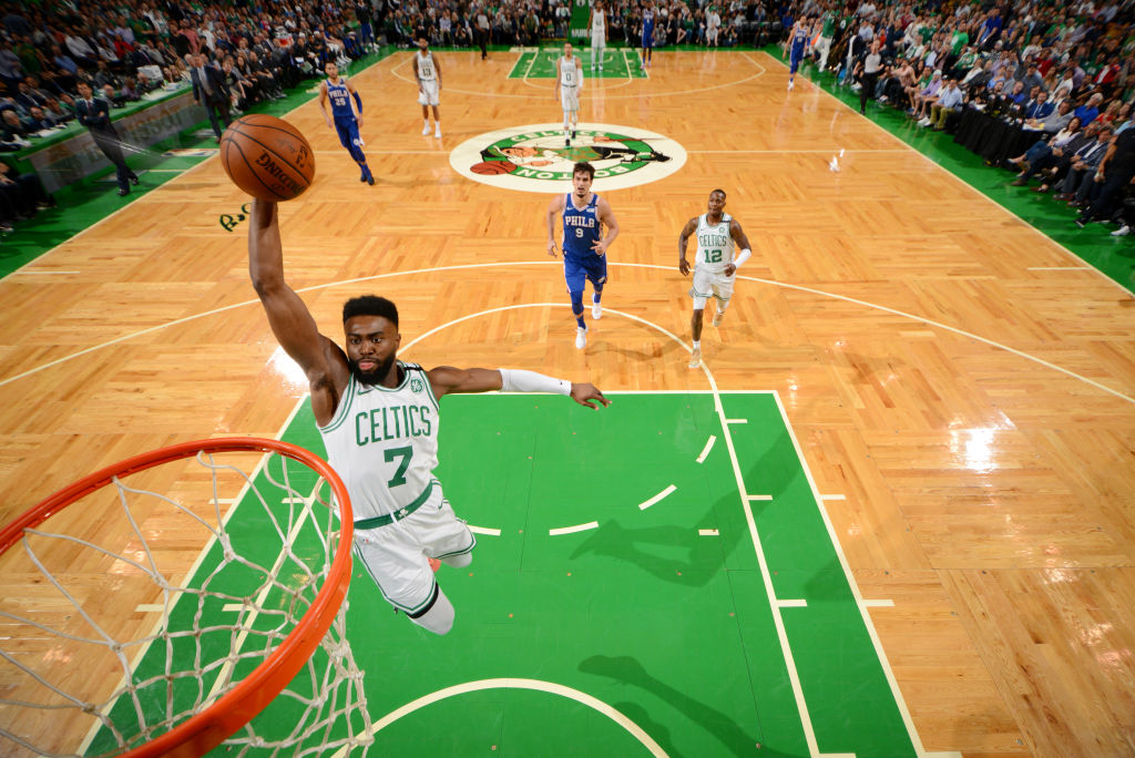 Jaylen Brown #7 of the Boston Celtics goes up for a dunk against the Philadelphia 76ers during Game Two of the Eastern Conference Semifinals of the 2018 NBA Playoffs on May 3, 2018 at the TD Garden in Boston, Massachusetts. (Photo by Jesse D. Garrabrant/NBAE via Getty Images)