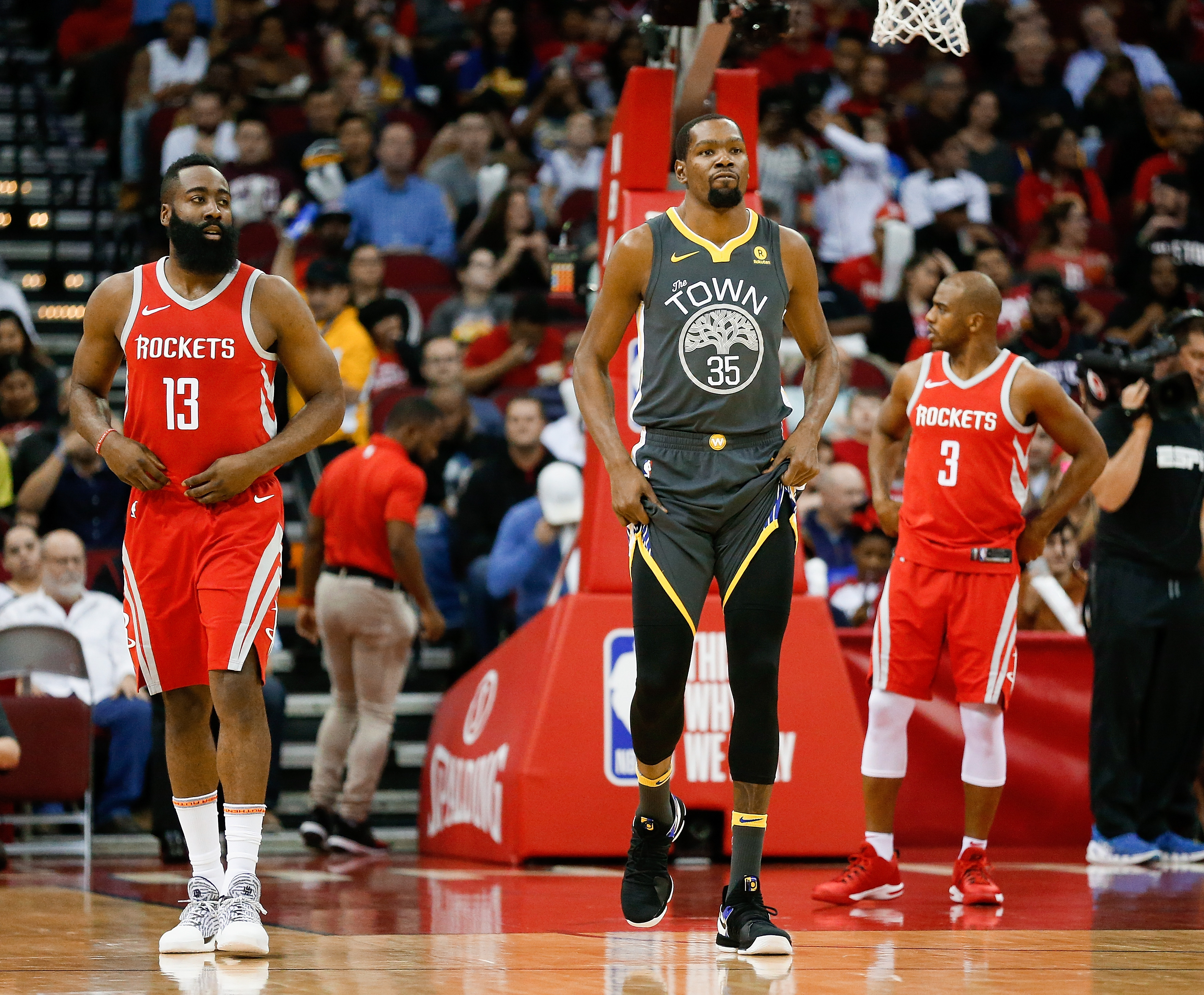 James Harden #13 of the Houston Rockets, Kevin Durant #35 of the Golden State Warriors and Chris Paul #3 of the Houston Rockets at Toyota Center on January 20, 2018 in Houston, Texas. NOTE TO USER: User expressly acknowledges and agrees that, by downloading and or using this photograph, User is consenting to the terms and conditions of the Getty Images License Agreement.  (Photo by Bob Levey/Getty Images)