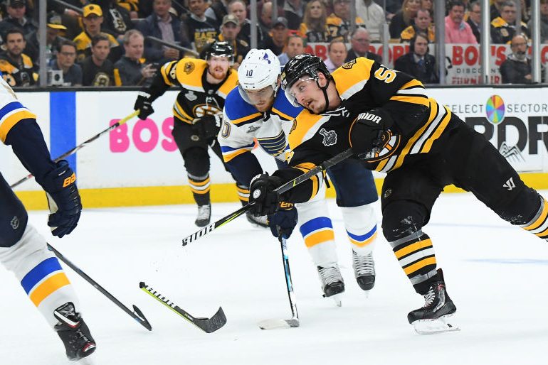 Noel Acciari has his stick broken against the St Louis Blues. (Brian Babineau/NHLI via Getty)