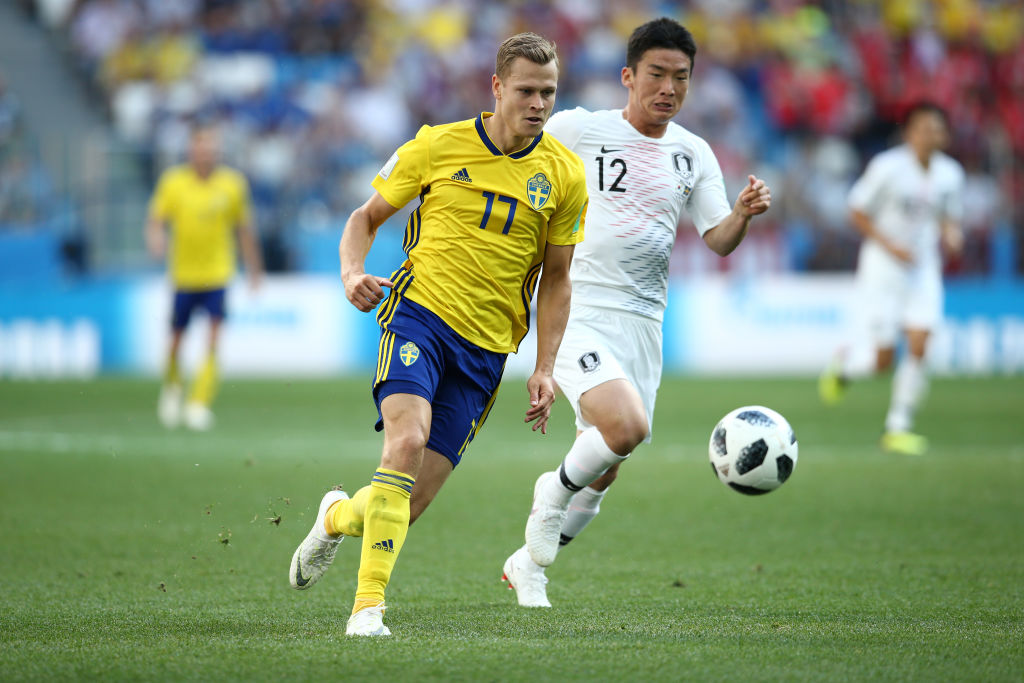 Viktor Claesson of Sweden and Kim Min-Woo of Korea Republic battle for the ball during the 2018 FIFA World Cup Russia group F match between Sweden and Korea Republic at Nizhniy Novgorod Stadium on June 18, 2018 in Nizhniy Novgorod, Russia. (Photo by Jan Kruger/Getty Images)