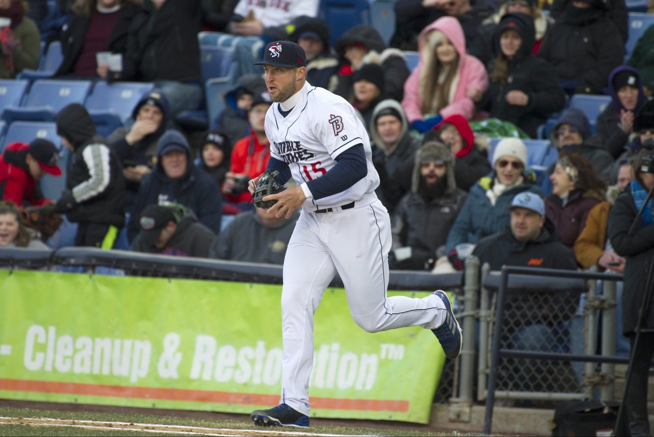 “Excitement doesn’t begin to describe what Nona Williams is feeling as she spots Tebow pop out of the dugout following the game wearing a short sleeve blue Adidas shirt with all three buttons done up to the collar and a black leather Adidas cap tilted slightly on his head,” writes The News‘s Julian Garcia.