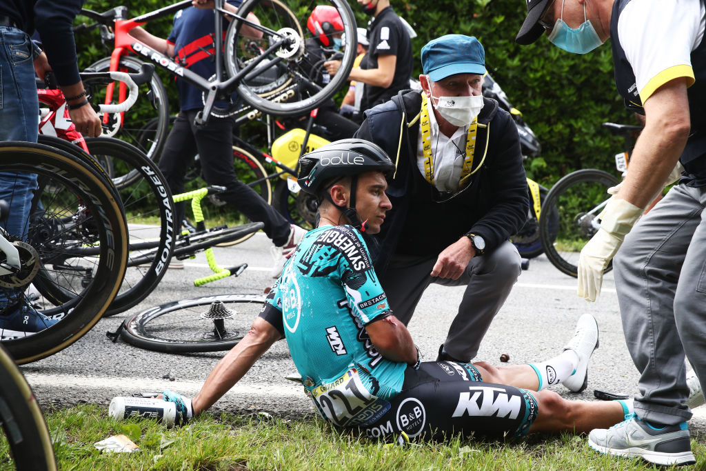 Bryan Coquard of France and Team B&B Hotels p/b KTM injury after crash during during the 108th Tour de France 2021.