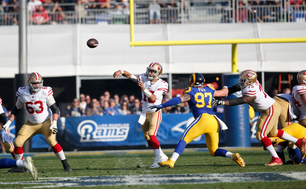 Jimmy Garoppolo #10 of the San Francisco 49ers passes during the game against the Los Angeles Rams at Los Angeles Memorial Coliseum on December 31, 2017 in Los Angeles, California. The 49ers defeated the Rams 34-13. (Photo by Michael Zagaris/San Francisco 49ers/Getty Images)