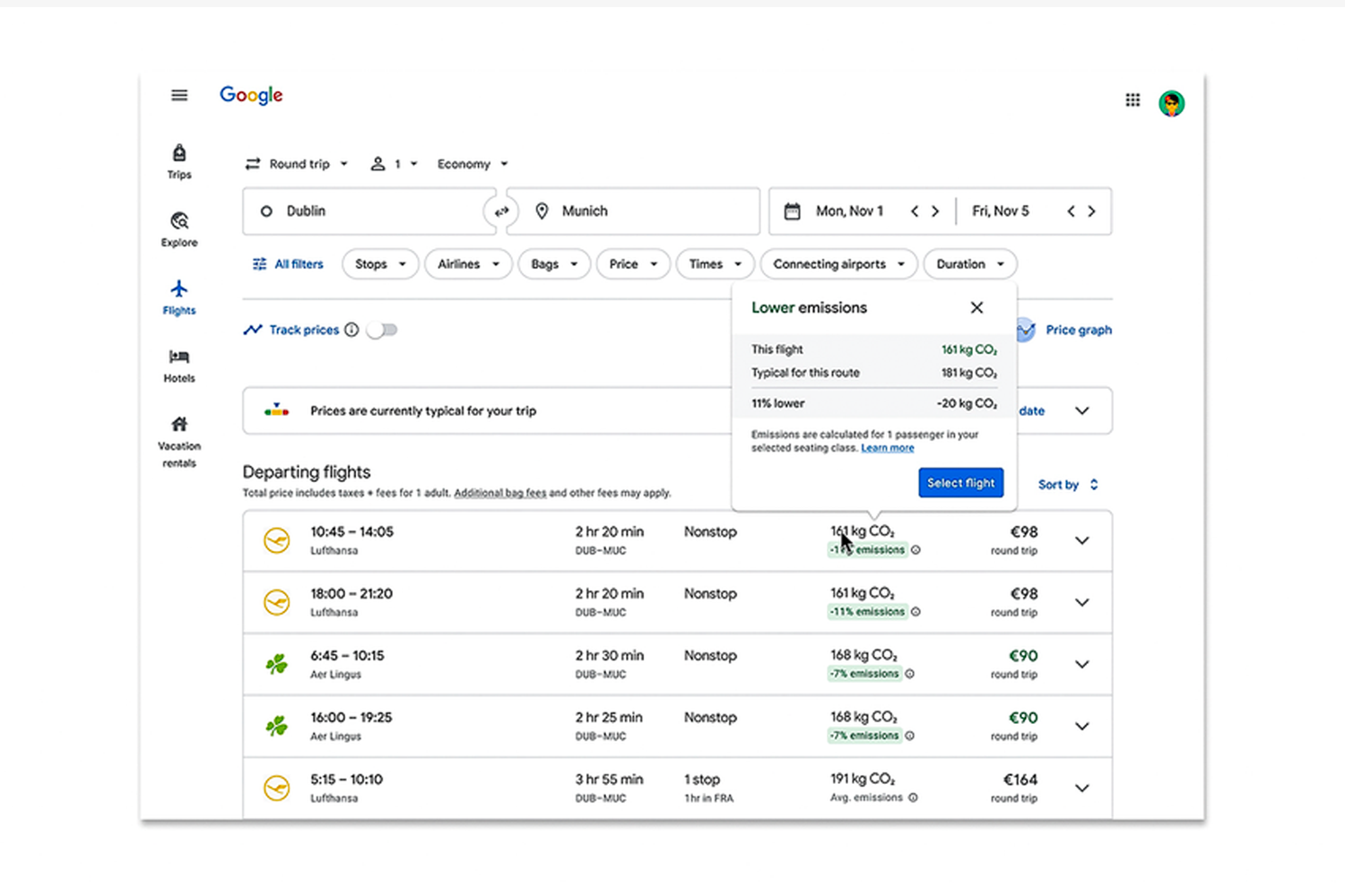 In the latest installment in a series of sustainable travel features launched by Google in recent weeks, is a new feature, located squarely between the price and duration of the flight, that while will allow users to carbon emissions for virtually every flight option.