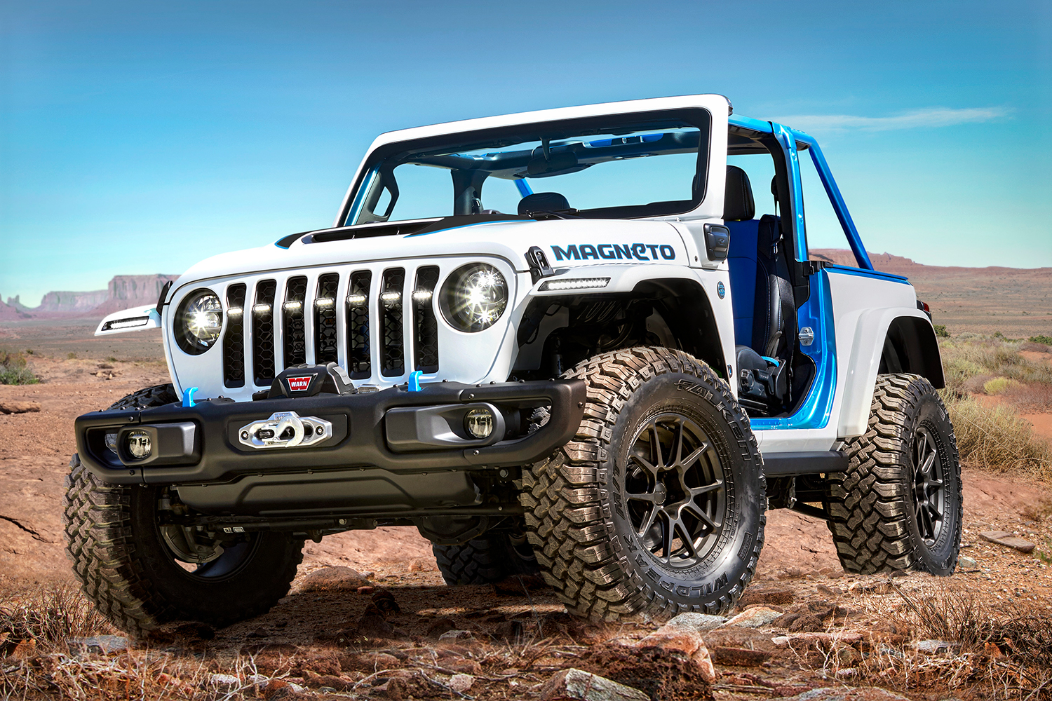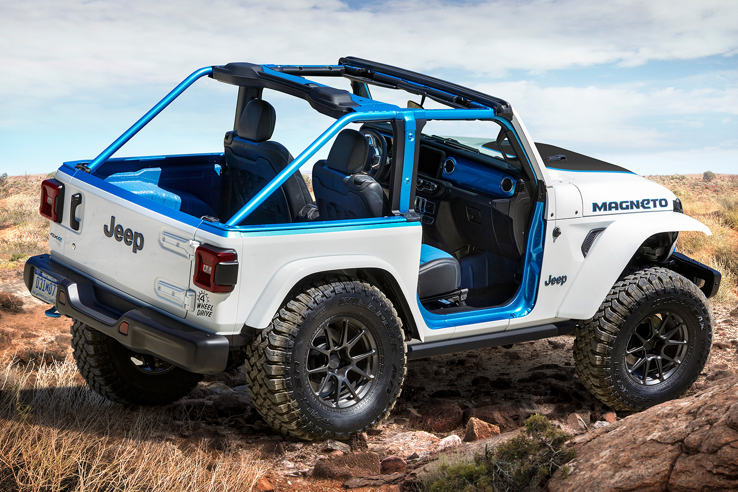 “Based on a two-door 2020 Jeep Wrangler Rubicon, the Jeep Magneto uses a custom-built axial flux electric motor that operates up to 6,000 rpm,” Jeep wrote in a press release. “The e-motor is connected to a six-speed manual transmission, creating a unique manual-electric powertrain with a clutch that operates as it would with an internal combustion engine. In quick-shift scenarios, the e-motor engages regen upon clutch engagement to prevent rev-hang.”