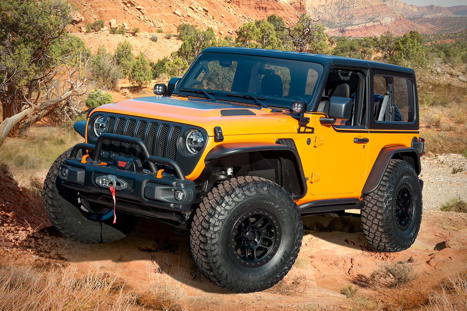 The other three new concepts include the Jeepster Beach, a restomod 1968 Jeepster Commando (C-101) that features a two-tone paint job with the colors “Hazy IPA” and “Zinc Oxide”; the Red Bare, a take on the Gladiator Rubicon truck with an enhanced 91:1 crawl ratio and some red flannel inserts in the seats; and the Orange Peelz, the other Wrangler, which features a ton of extras from Jeep Performance Parts (as do all of the builds), including prototype half doors.
