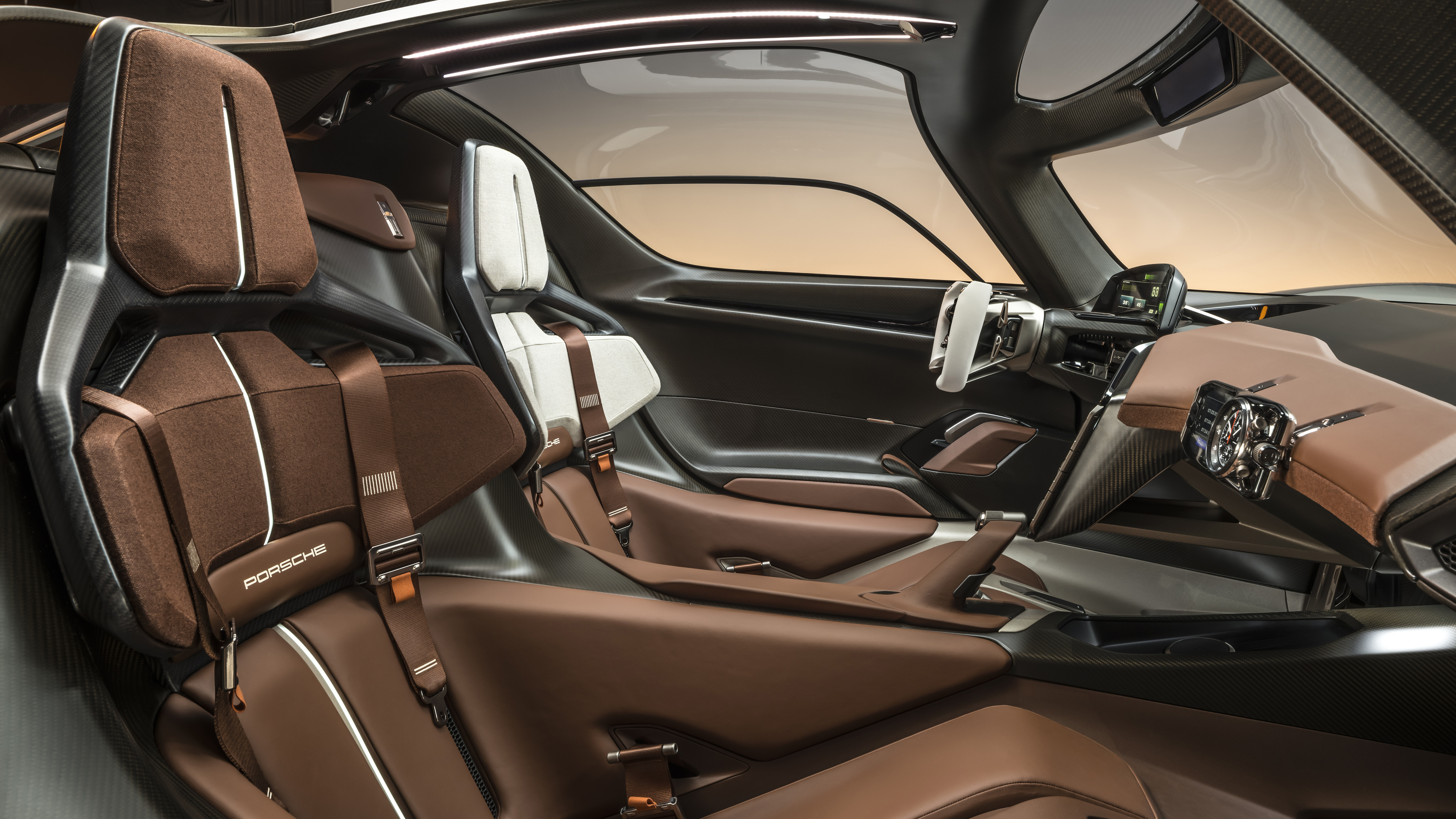 Right off the bat, its Le Mans race car influence immediately jumps out. The car’s exterior looks less carved and more like a sheet of carbon fiber was melted over the platform. Its cockpit bubble sits low between the four outstretched wheels, with doors that flair out when opened to make it decidedly easier to egress than its racy inspiration. At the front of the ample front wheel hubs are LED modules that are a reinterpretation of the four-point headlight graphic that has been a signature Porsche design element.