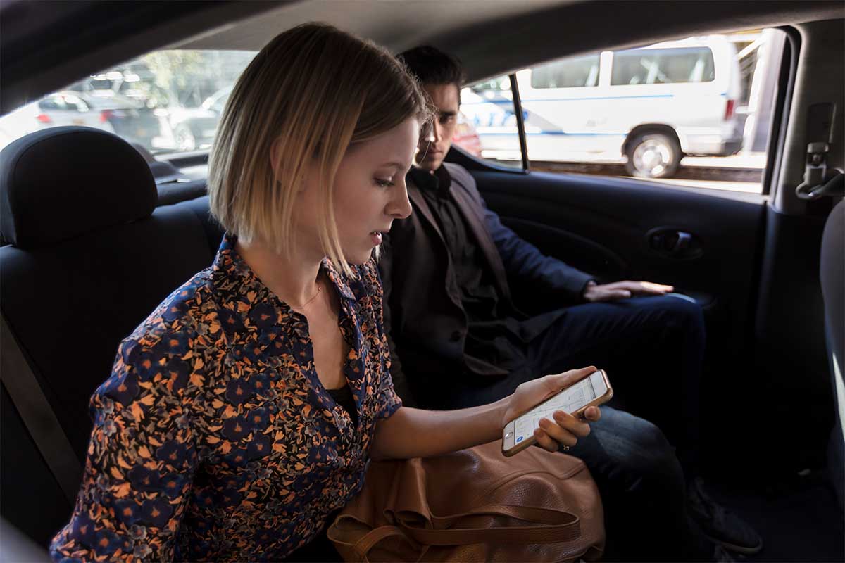 Man and woman sitting in car looking at phone. Uber has announced video ads are coming to its apps and even on tablets in its cars.