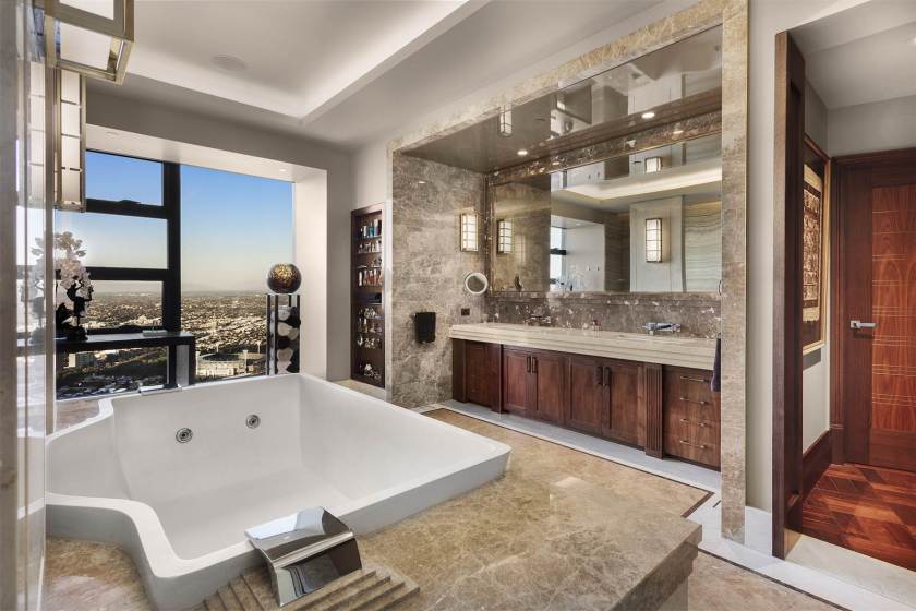 Designed for lavish entertaining and family living, the luxury pad boasts a grand dining room and relaxed and formal living rooms, as well as a plush theater. Separated from the butler’s pantry by a luminous onyx divide, the spacious family kitchen, filled with natural light, is the perfect space to enjoy your morning coffee up in the clouds. The barbecue area adds to the already long list of amenities geared for hosting guests, with a recycled timber floor and stainless steel appliances.