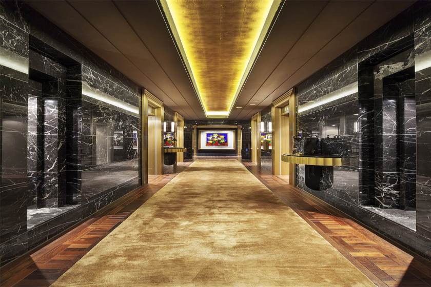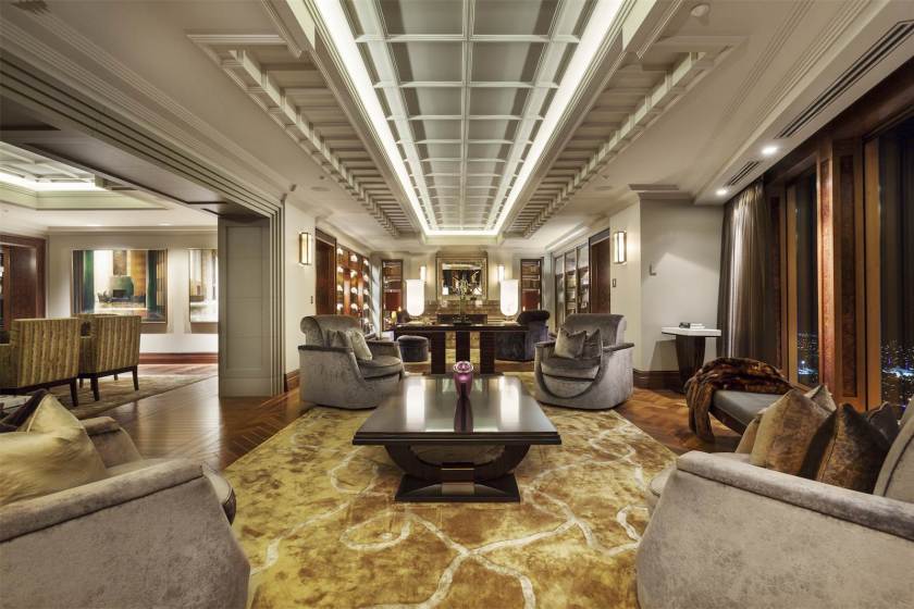 The 7,100-square-foot penthouse, outfitted in the classic New York Art Deco style, was renovated over two years to reflect the former owner’s refined taste. The home features imported hand-carved ceilings, leather-padded walls, brass door inlays, silk carpets, French oak hardwood floors, Italian marble, and a gas fireplace (the only one in the entire building). The gold leaf entrance, ornate ironwork, and elegant timber cabinetry evoke style sentiments of the 1920s.