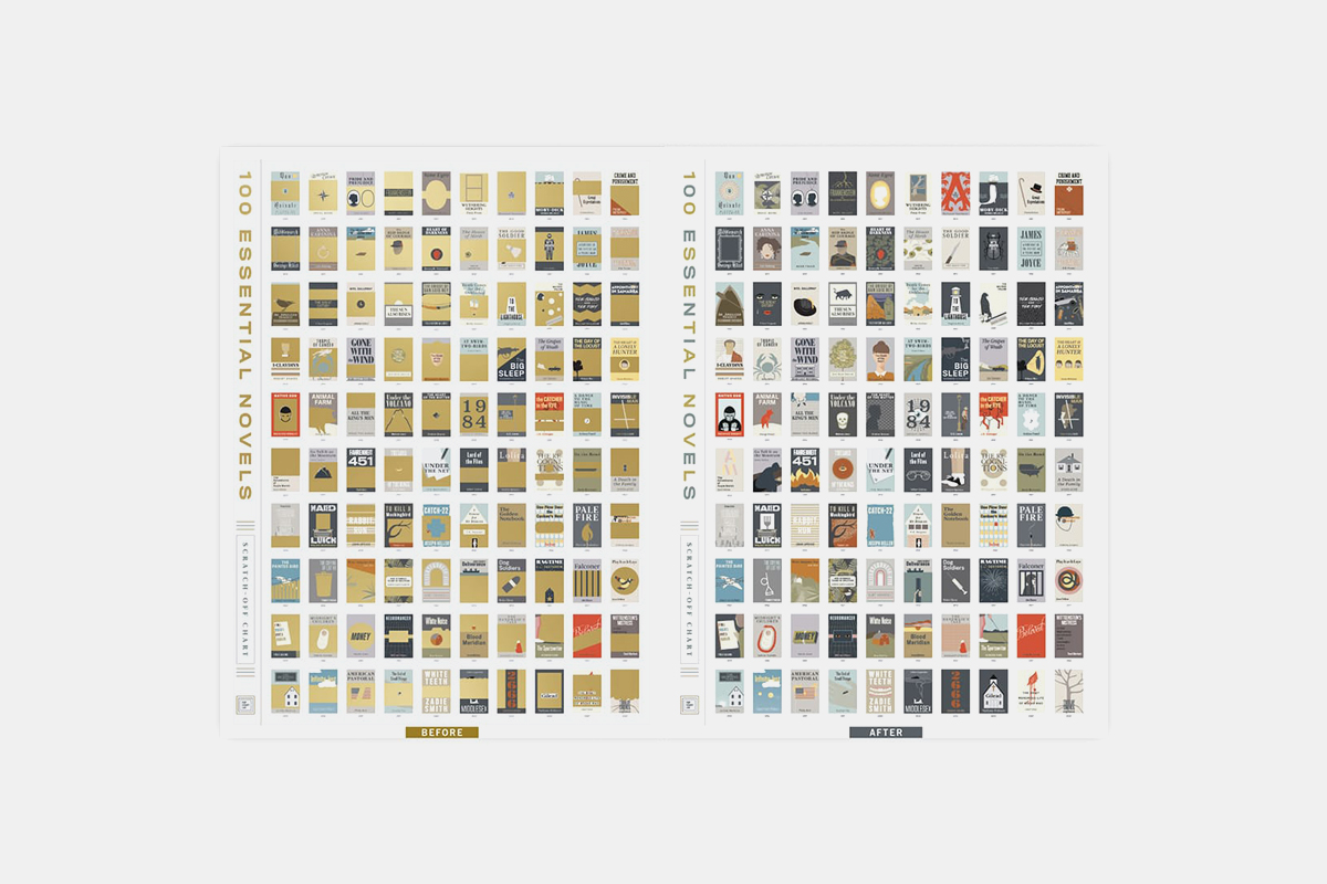 The art is whimsical and accessible, a no-brainer for the wall, and often substantial in size, considering the affordable price-point ($30-40, starting at 18 X 24″). Some of the posters are even “scratch-offs.” I’m currently working my way through the 100 Essential Novels Scratch Off.