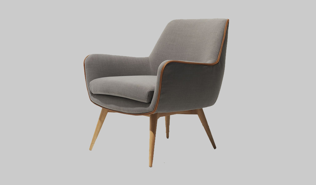 A nod to classic Scandinavian design, solid oak dowel legs holds up a comfortable seat made from Ludo Grey fabric with leather piping.