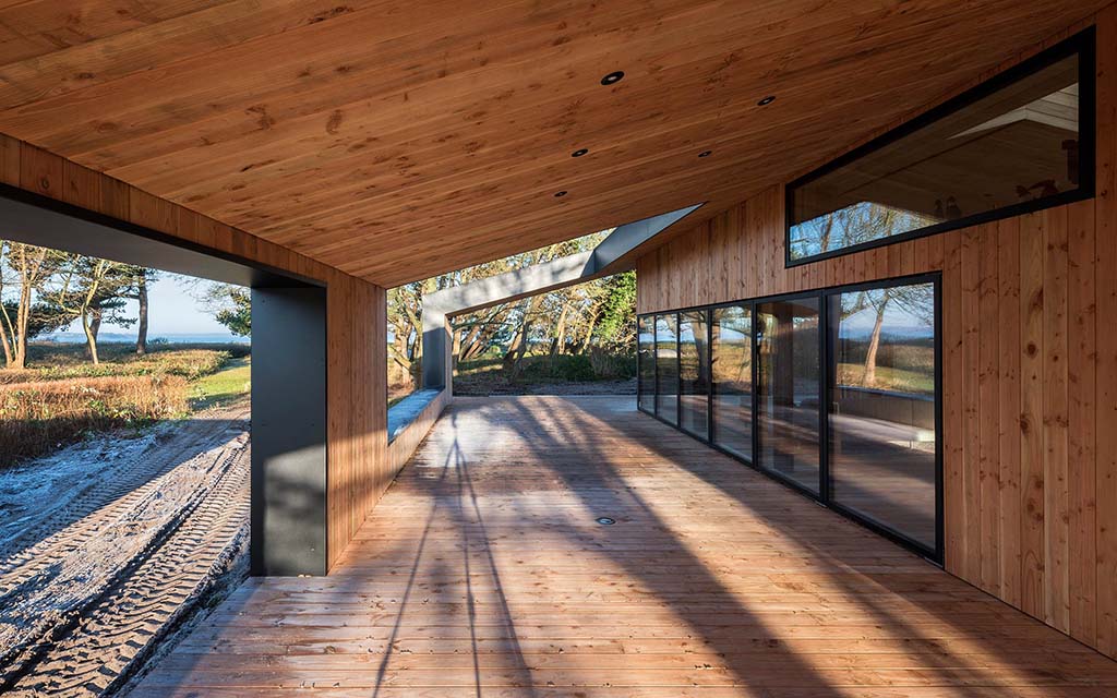 The architects wanted to reconcile their love for large-scale projects with the subtlety of a traditional summer home. And that vision has been realized in the form of a structure with a much larger footprint than the living space itself occupies: the excess makes up a partially covered patio living snugly under the pitched roof, with both gaps for sunlight and cover for weather protection.