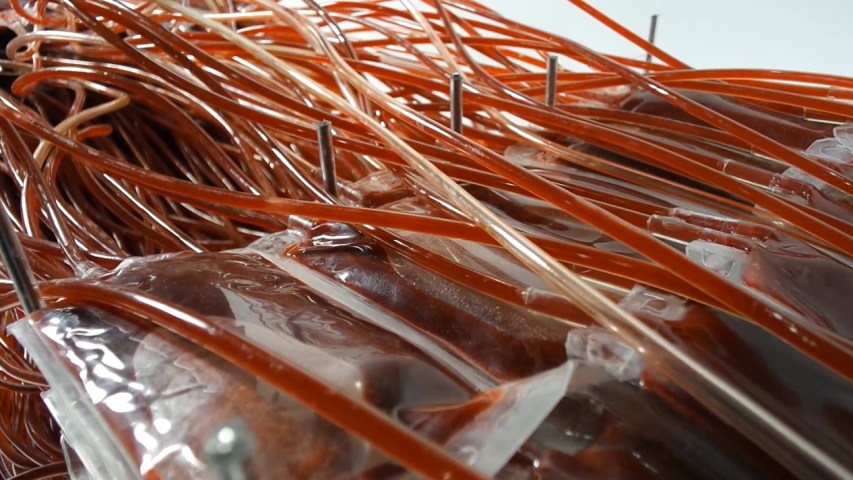 The Red Series 001 Breath chair is made of blood bags connected by vein-like tubes in the middle. The seat sinks under the weight of someone sitting down, deflating the blood bags to reveal the steel frame underneath (see video below).