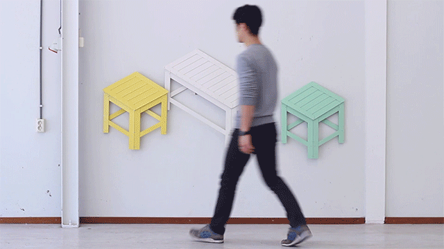 The result of his exploration is De-Dimension, a collection of collapsible furniture that can hang flat against the wall to create a trippy optical illusion, or be unfolded to create the functional version of itself.