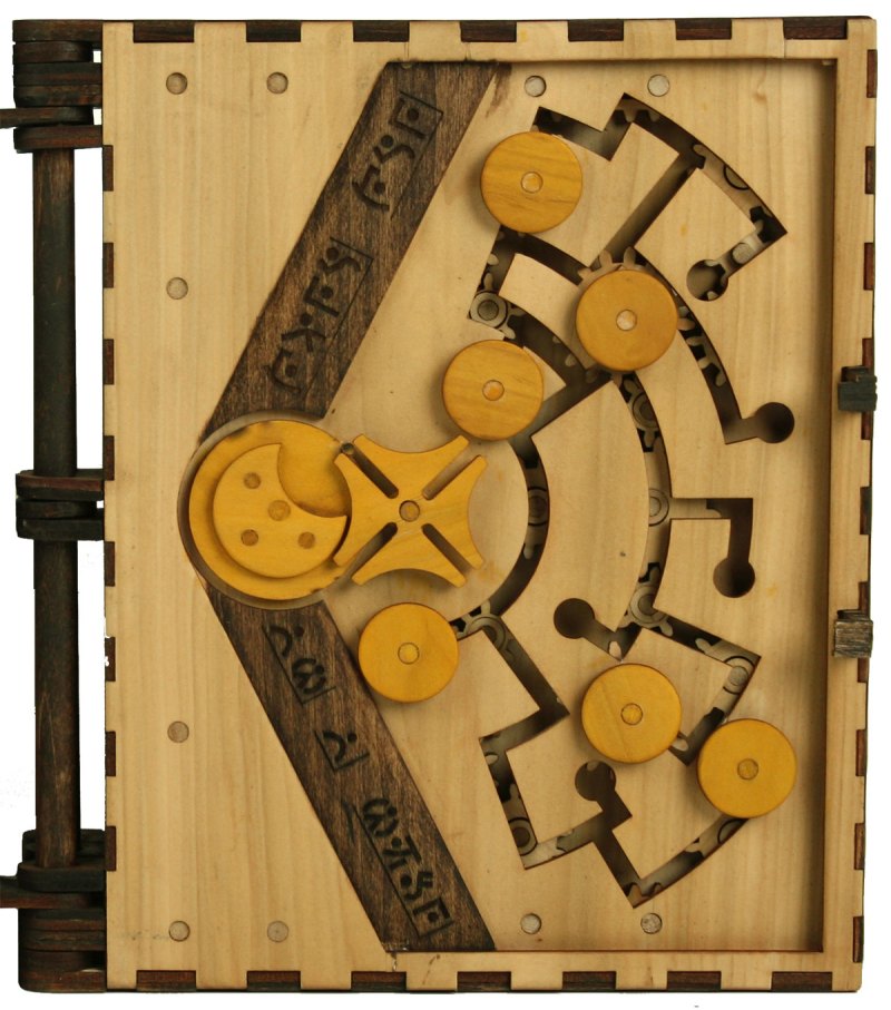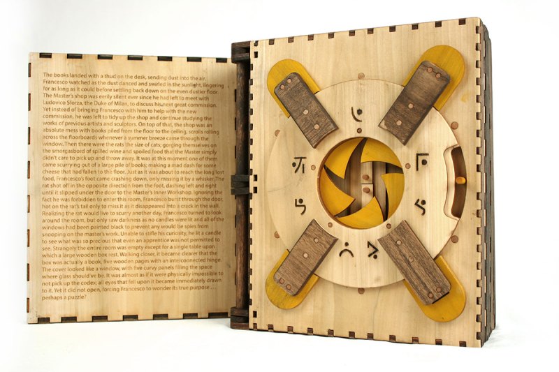 But you can’t just crack the book, flip through its pages, and call it a day: Each page is its own puzzle that needs to be unlocked before you can turn to the next one. (The puzzle pages consist of a Mechanical Iris, Rotating Maze, Geneva Gears, Paradox Sliders, and Cryptex Lock; see images of three of them below.) After solving each page, the reader will also find a portion of a short story about an apprentice in Leonardo Da Vinci’s workshop, so you get a little bit of knowledge to go with your brain-tease.
