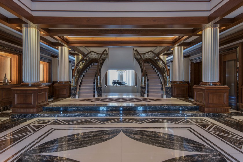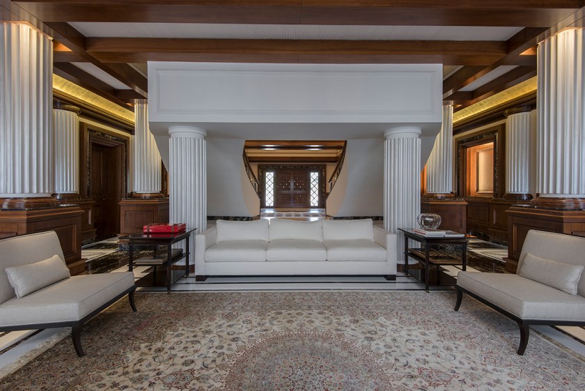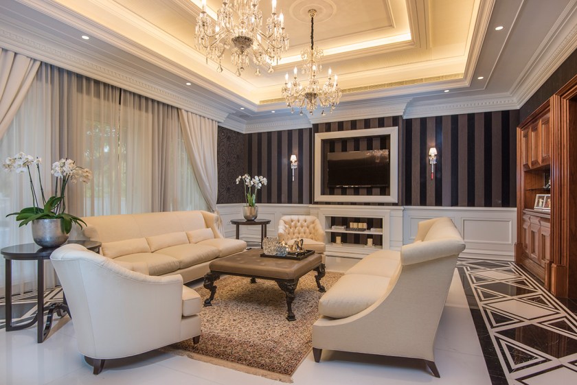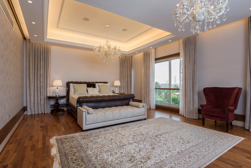 The Emirates Hills property, located in Dubai, United Arab Emirates, is about as high-end as you can get from all angles. Besides sitting in an exclusive neighborhood that overlooks said 18-hole golf course, the Montgomerie, the 18,358-square-foot estate was built using only the highest quality materials. These include Italian marble; solid wood walls, doors, and window frames; furniture from the likes of designers Ralph Lauren, Becker, and Giorgetti; and hand-made curtains from Rubelli. A one-of-a-kind Murano chandelier ties the high-ceilinged living room together.