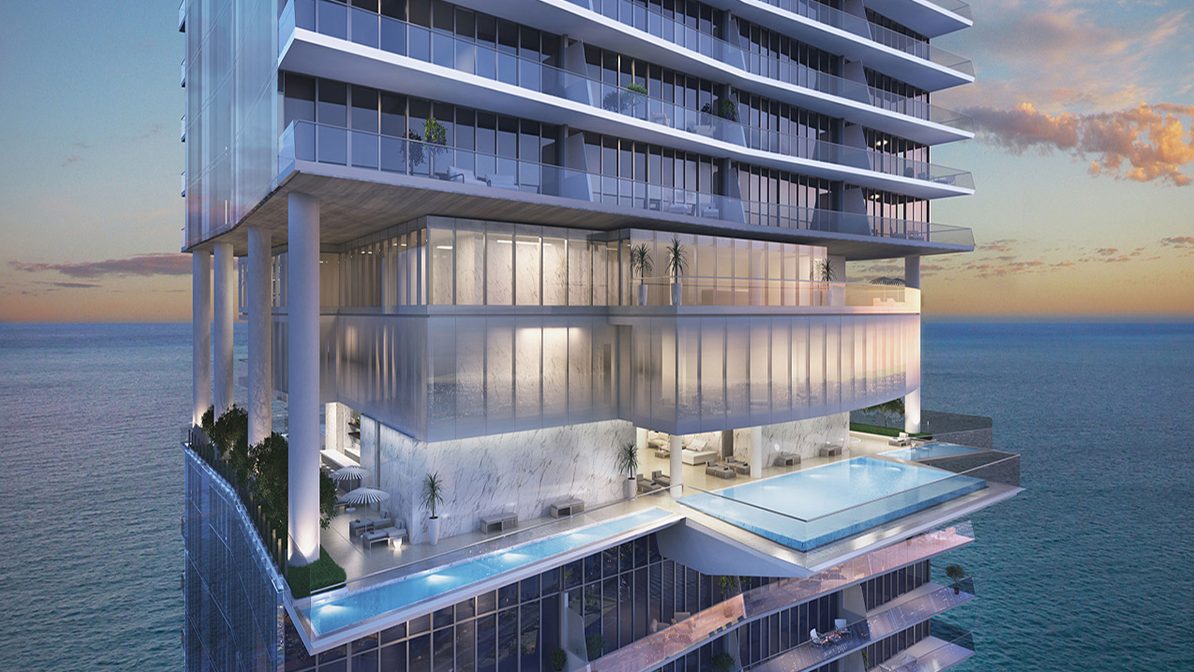 The 54-story modern glass tower, designed by architects Carlos Zapata and Robert Swedroe, offers four separate luxury residence options: a three-bedroom (2,900–3,110 square feet); four-bedroom (3,625 square feet), five-bedroom (6,695 square feet); and six-bedroom (10,645 square feet). All residences include sweeping ocean views, access to three pools, optional membership privileges to a resort and country club, and five-star concierge services.
