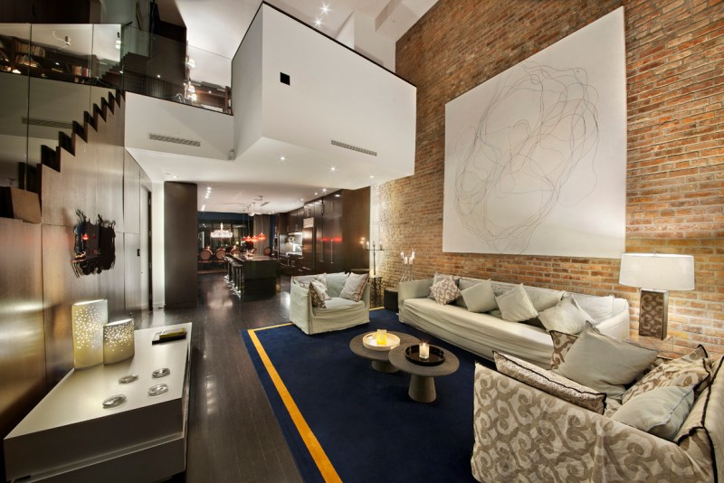 The first- and second-floor space opens to 22-foot-high ceilings, Brazilian hardwood cherry floors, Brazilian glass mosaic tiles, and Wenge wood paneling. (It also includes a Cantilever balcony with a built-in projector.) The kitchen has a 20-foot island with Italian granite counters and Wenge cabinets, as well as a state-of-the-art wine cooler.