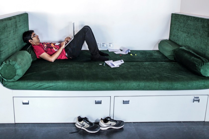 A Tiny Owl employee lies working on a laptop computer at the company’s head office in Mumbai, India, on Monday, March. 9, 2015. Tiny Owl is a smartphone application that helps hungry city-dwellers scour nearby eateries for deliveries. (Dhiraj Singh/Bloomberg via Getty Images)
